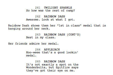 La verdad yo no lo consideraría un final alternativo, sino más bien como un final completo; sin embargo así lo mencionó Meghan McCarthy. La reconocida guionista de MLP mostró en su twitter 2 imágenes pertenecientes al guión del episodio, señalando que forman parte de un final alternativo...